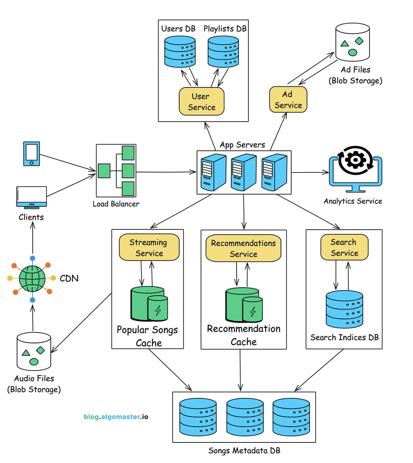 The actual delivery of music files is managed by a Content Delivery Networks (Cloudflare, AWS CloudFront). This ensures that music is served from geographically distributed servers close to the user, minimizing latency and bandwidth consumption.