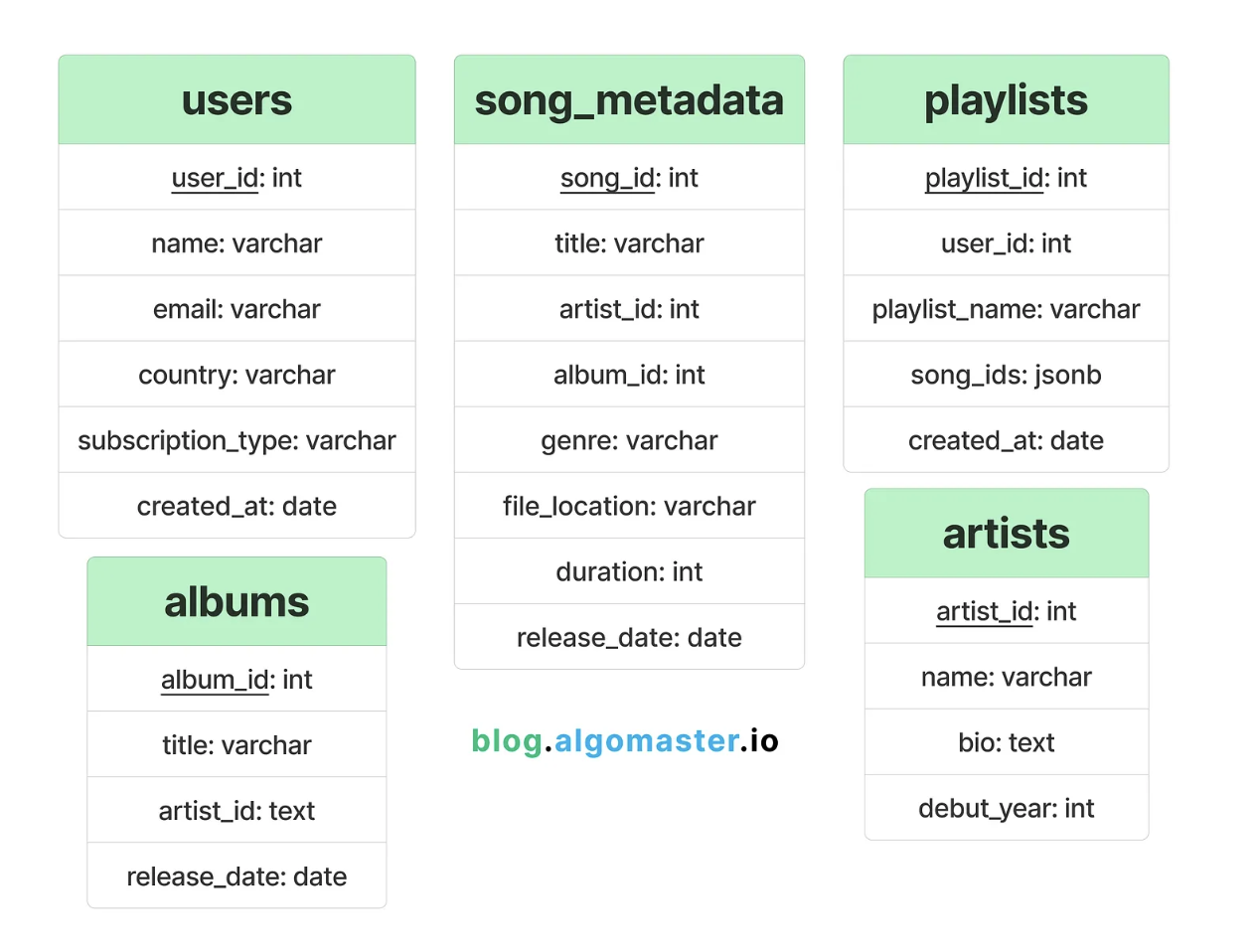 To store highly structured data like user profiles, playlists, songs metadata, artists and albums, we can use a relational databases like PostgreSQL or MySQL.