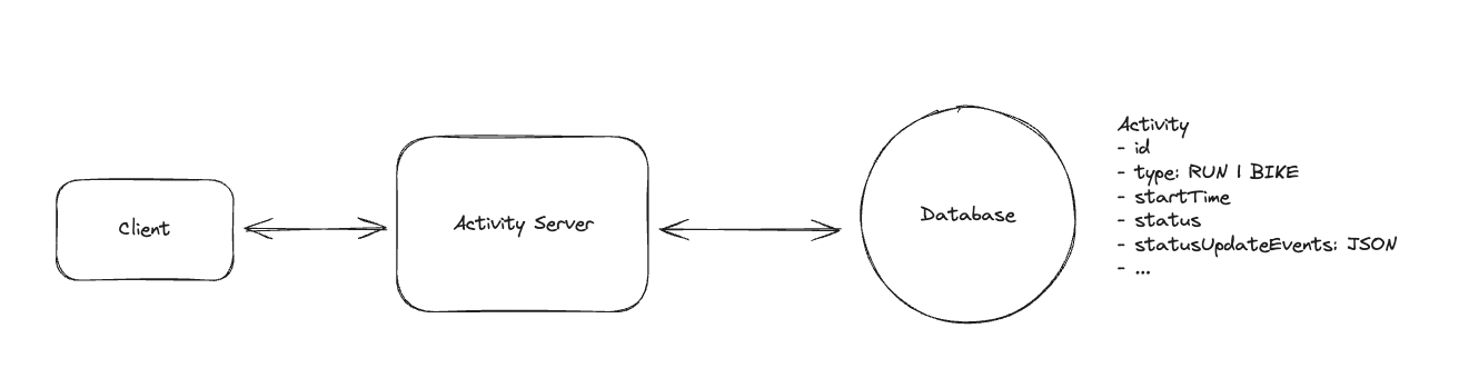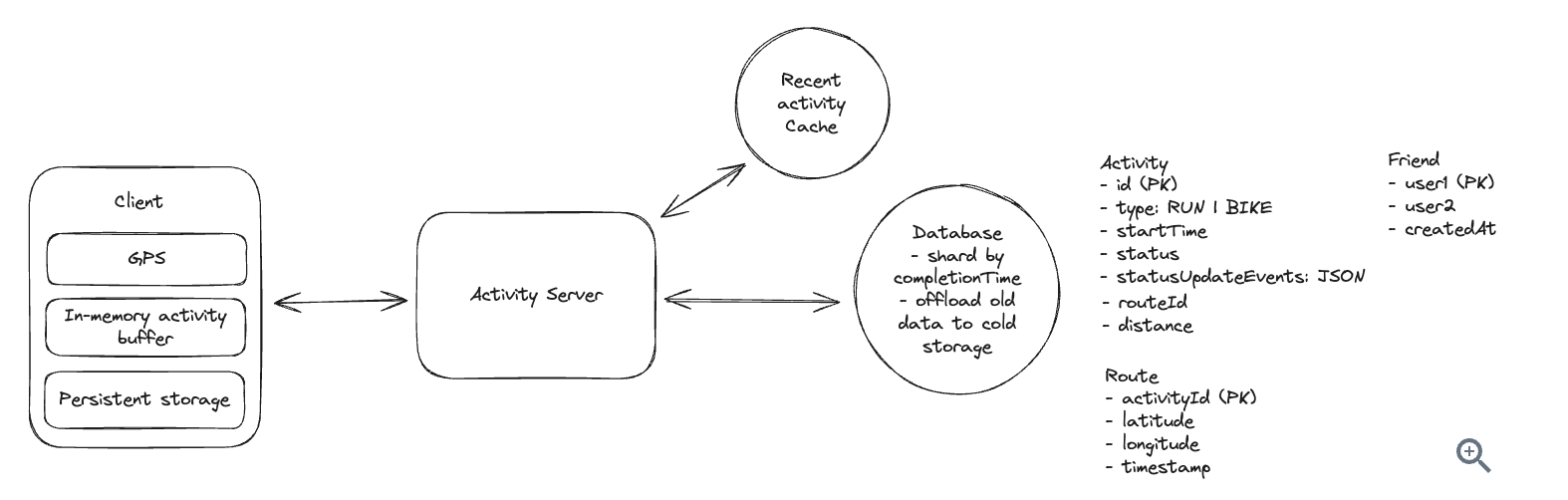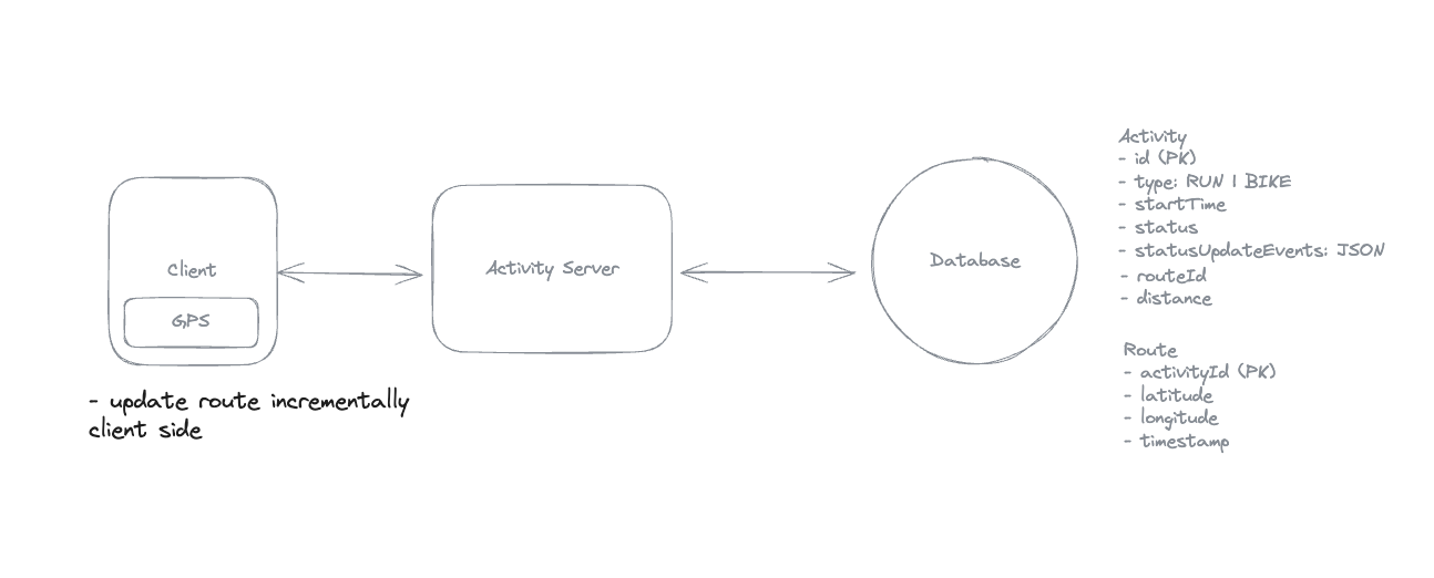 The key insight is that, so long as we don’t support realtime-sharing of activities, we can record activity data locally, directly on the clients device and only sync activity data back to the server when the activity completes and/or the user is back online.