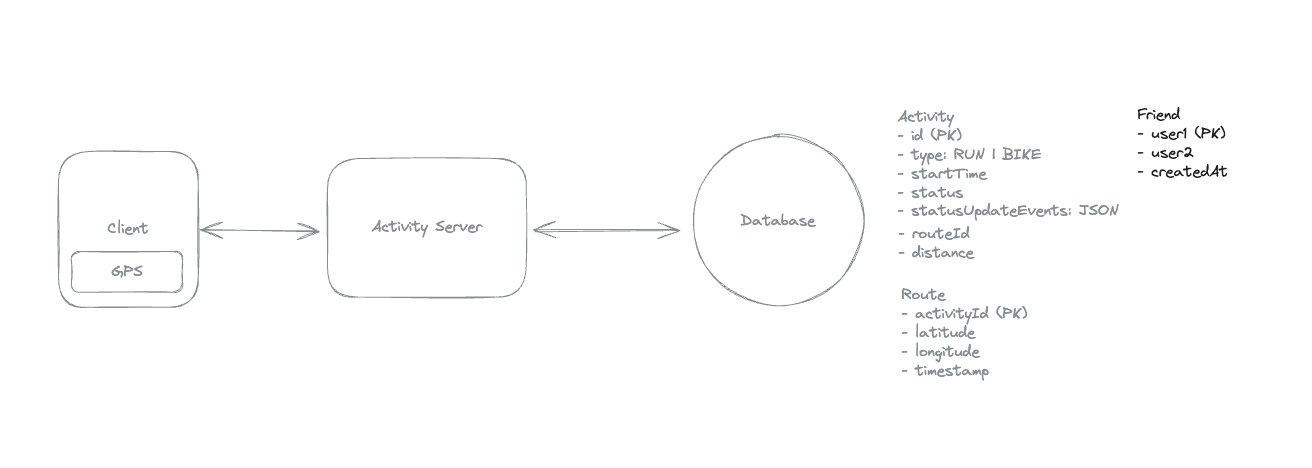 Route: A collection of GPS coordinates recorded during the activity (this could also just be a field on the Activity entity).