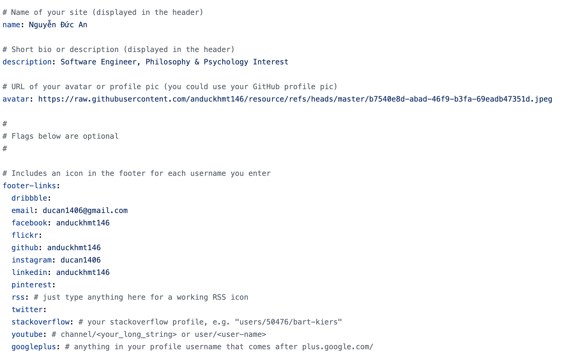 Step 6: Go to _config.yml and change some information in Header (Name, Title, Image) and Footer (Social Media) to yourself, and about.md file for your “About Me” tab.