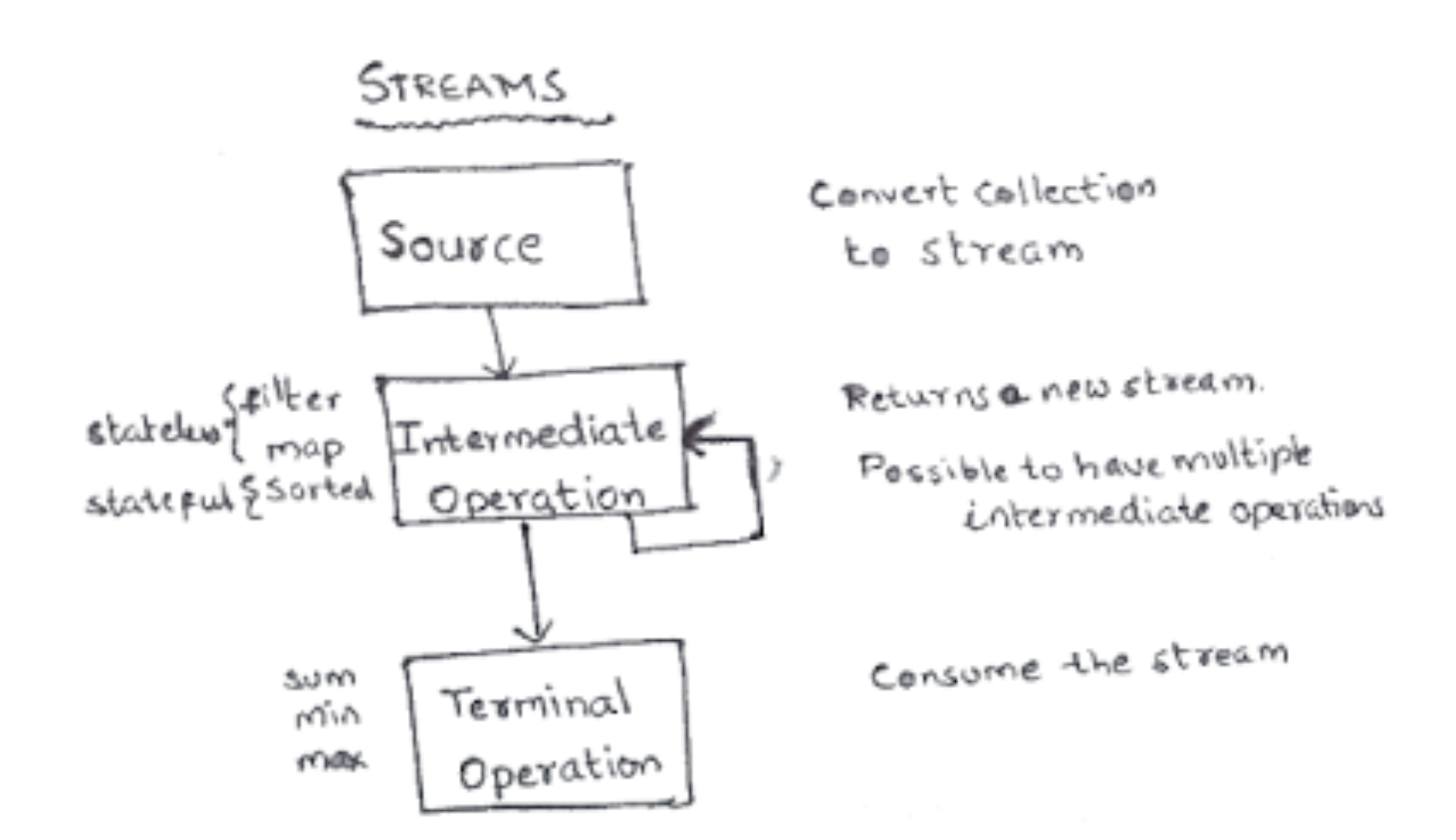 - Source → intermediate ops (map/filter/…) → terminal op (collect/forEach/reduce/…).