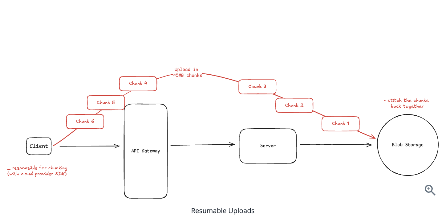 45.8. Uploading large video files can be challenging due to network interruptions. Explain how your design allows users to resume an interrupted upload without starting over from scratch.