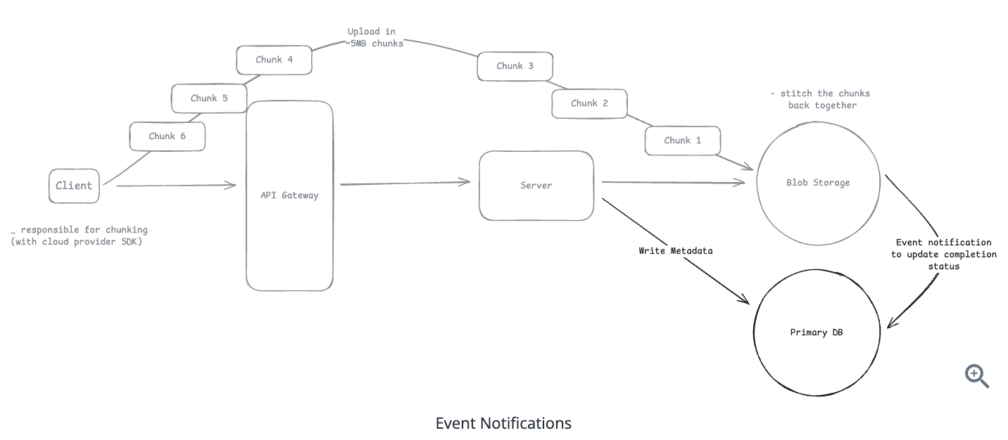 46.9. How would you handle the upload of large media files efficiently, particularly videos that could be up to 4GB in size?