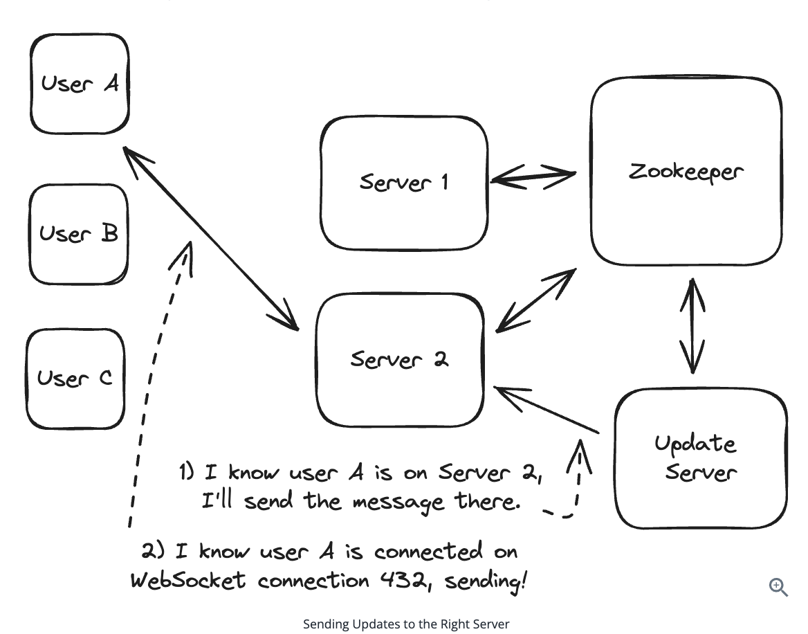 When users are on different servers, the system needs routing mechanisms like pub/sub or direct server-to-server communication to deliver messages across server boundaries.