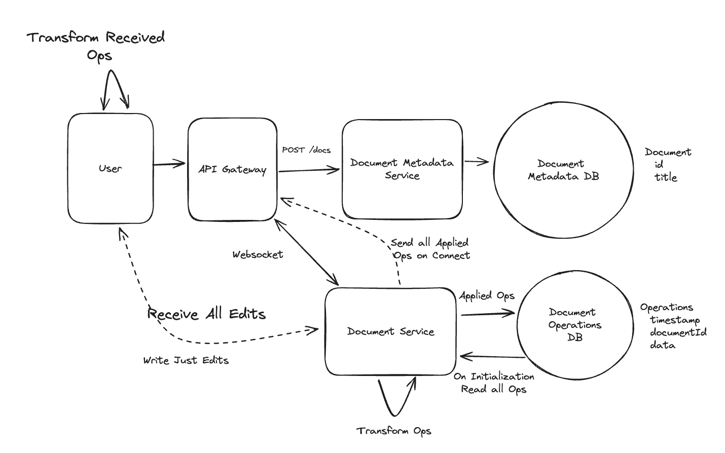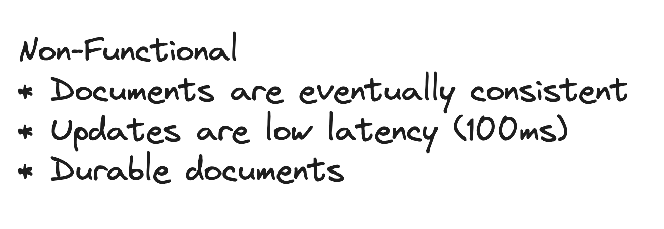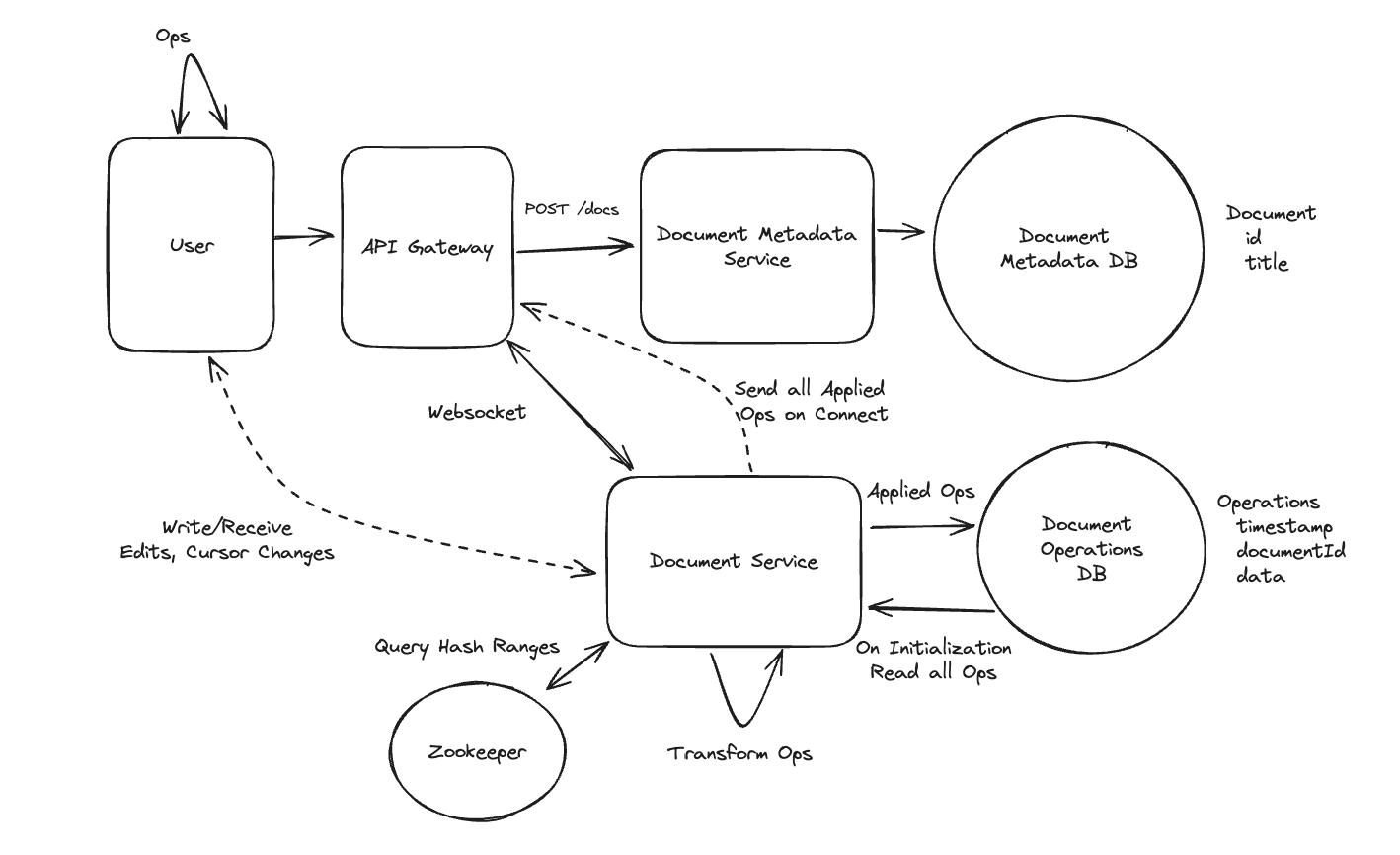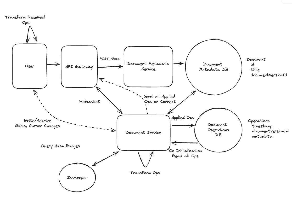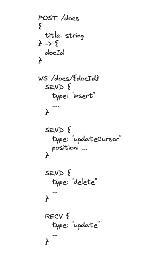 - Users will frequently send updates to their cursor position (no need to send if it doesn’t change!) to the Document Service which will update the struct for that user and broadcast to all connected users => Else offline.