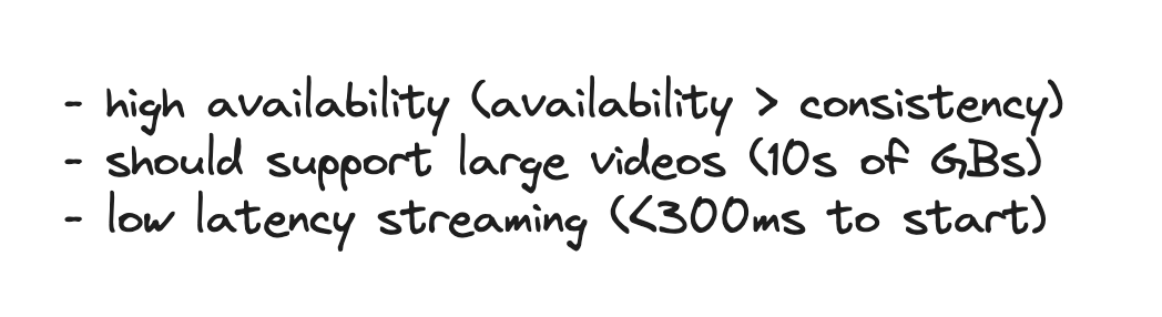 - Video Processing Service: 240p, 360p, 480p, 720p, and 1080p => multiple chunk to download by bandwidth.