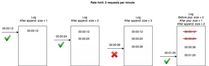 Keeps track of timestamps for each request in a time window that “slides” forward. Removes old timestamps and counts current ones to make decisions.