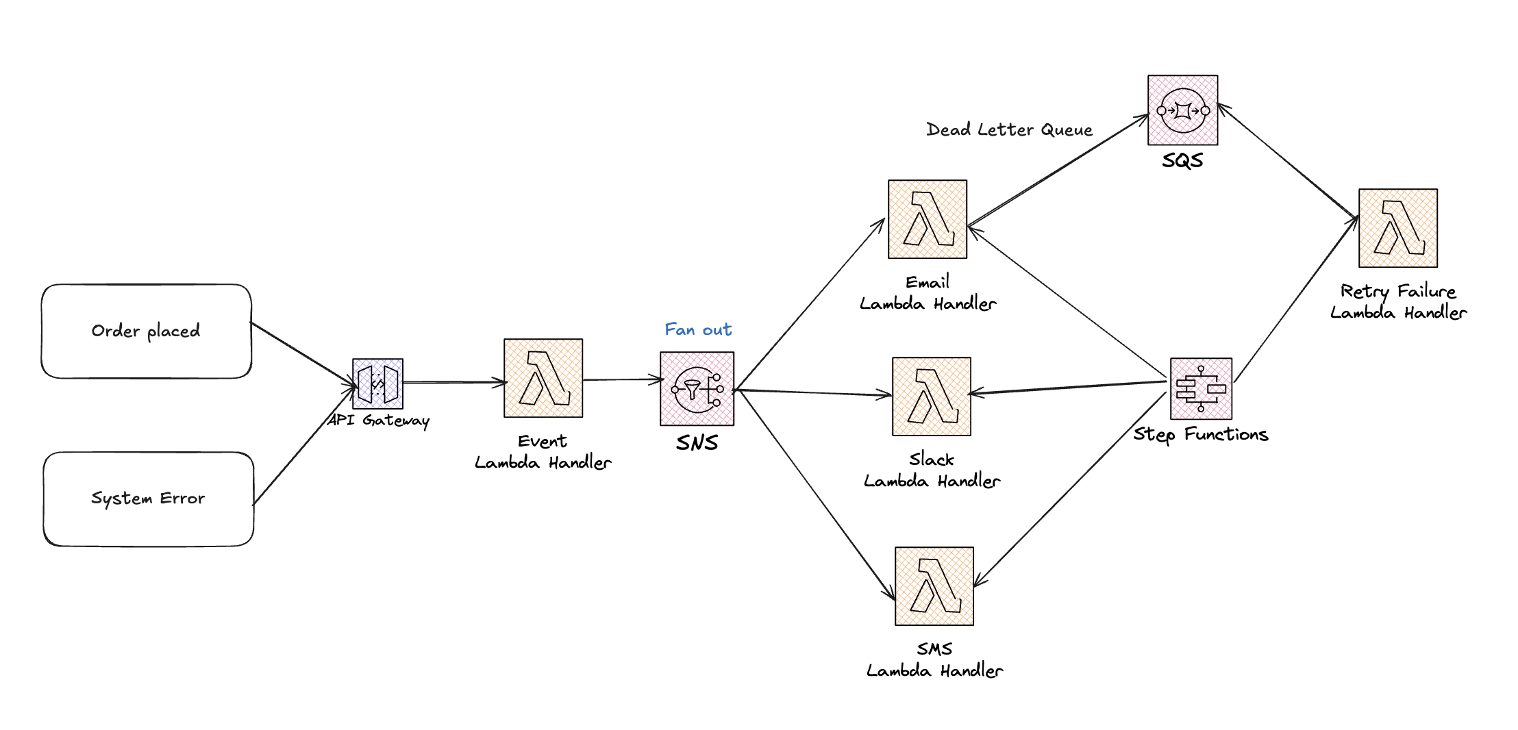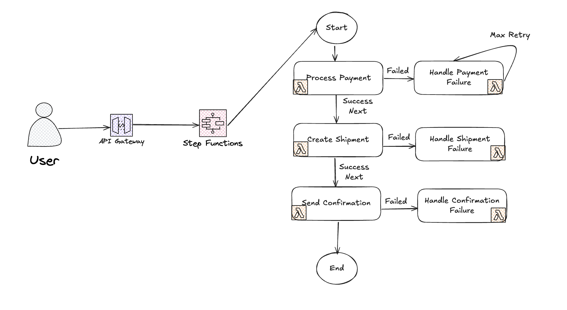 - Step functions: work as a state machine in SAGA pattern: Orchestration Saga, Choreographed Sagas